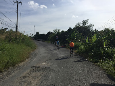 After lunch we drove another hour before arriving somewhere on the outskirts of Can Tho. There we rented bikes from a homestay place and then biked around some villages along the river. It was really peaceful; we biked along a narrow path where there were no cars and only 1-2 motorbikes. There were houses all along this path. Here are some action pics of Martin biking that I took. Our guide is in front of him and the biking tour guide is in front of him. We were never short of guides on this trip!